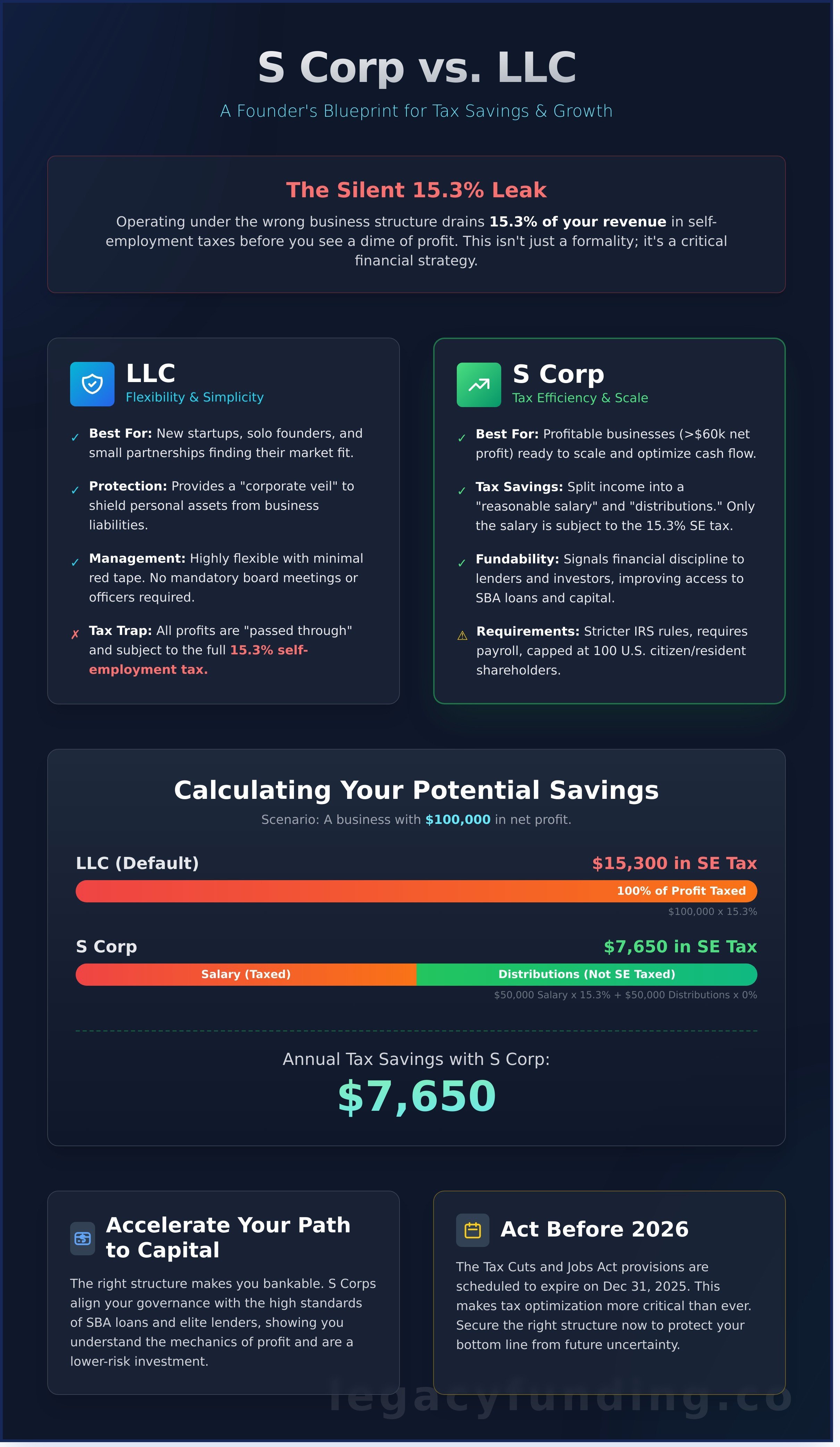 Why is 2026 the year to stop settling for "good enough"? The economic climate demands efficiency. If your business is generating over $60,000 in net profit, staying as a standard LLC could be costing you upwards of $9,000 annually in unnecessary FICA taxes. You need that capital to hire, market, and dominate your niche. Legacy Funding knows that the right structure is the gateway to high-level credit lines. We see it every day. Founders who optimize their tax status early are the ones who Get Funded faster. They show lenders they understand the mechanics of profit, not just the art of the hustle. Use this year to transition from a hobbyist mindset to a corporate powerhouse.
